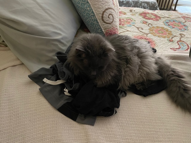 He told my mommy, “Well, Squeeky thinks we’re gonna be sitting down to eat after this, since I’m cooking. She’s going to expect me to put her on the bathroom counter and pet her while I brush my teeth because that’s our routine.”