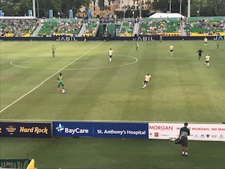 Me: ” All I know is that they have green and yellow outfits and play at Al Lang Stadium, which is a historic old minor-league baseball stadium right on the bay in Saint Pete. I have never been to it, but know it is a beautiful stadium. I figure, what the heck, at least I can get a look at the stadium and think about what happened in the past.”