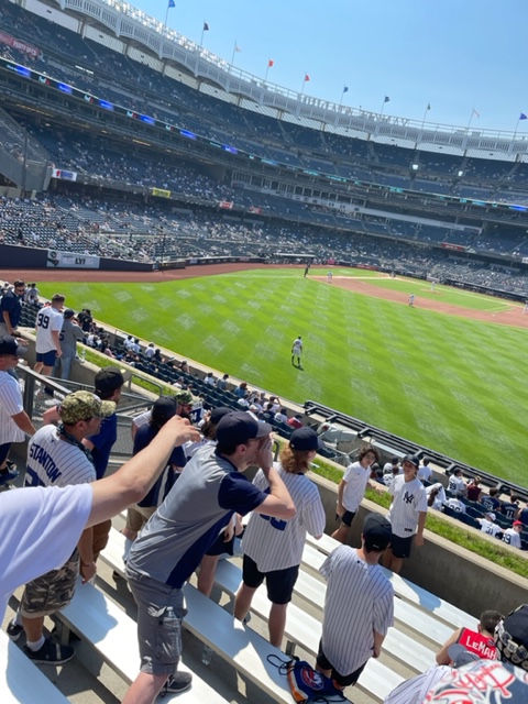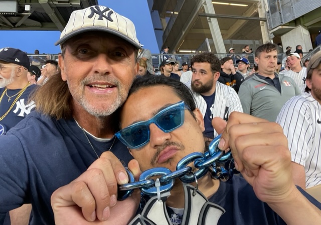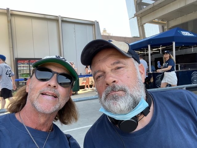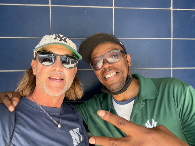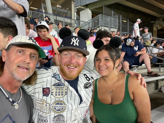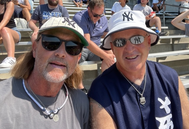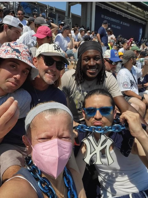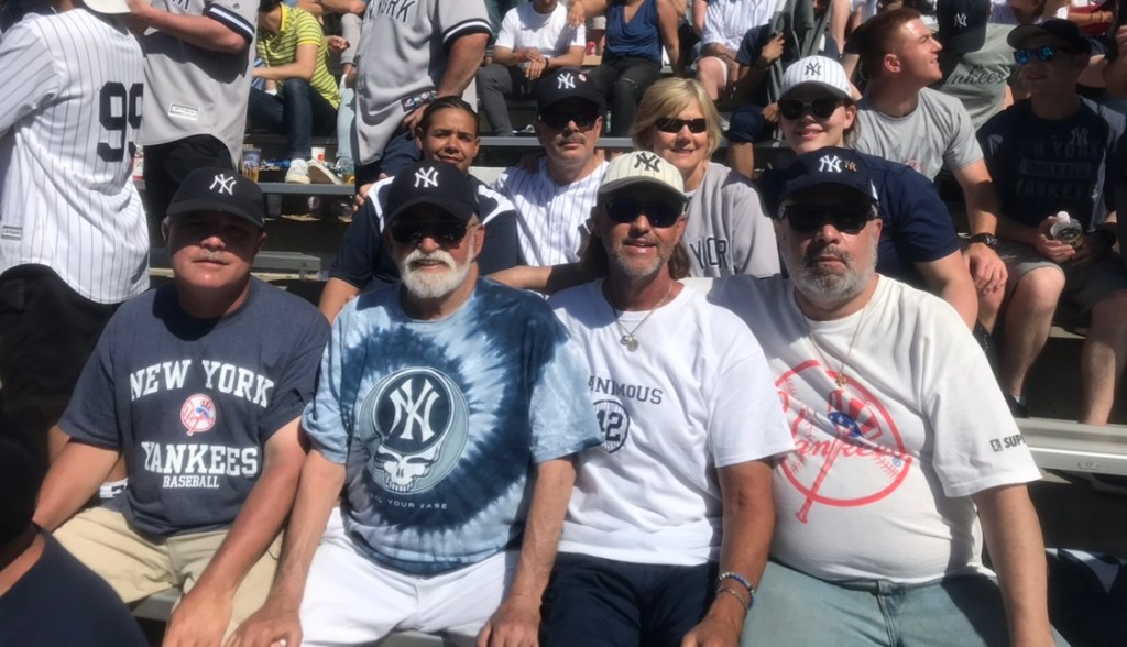 I’ve been doing my nonsense videos since last July and have made a lot of friends on Facebook, many of which are New York Yankees folks. One guy that sees all of my stuff is Jayden. My nickname for his is “Bucket Brains” because he’s always wearing a Yankees bucket hat. Yet, I haven’t seen him commenting on any of my posts in about three weeks. I walk down the steps to my seat and I see him. He yells out, “Hey folks. So anyhow” and comes up and gives me a big hug.