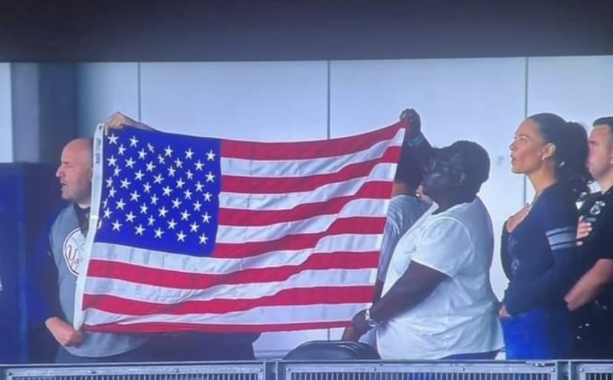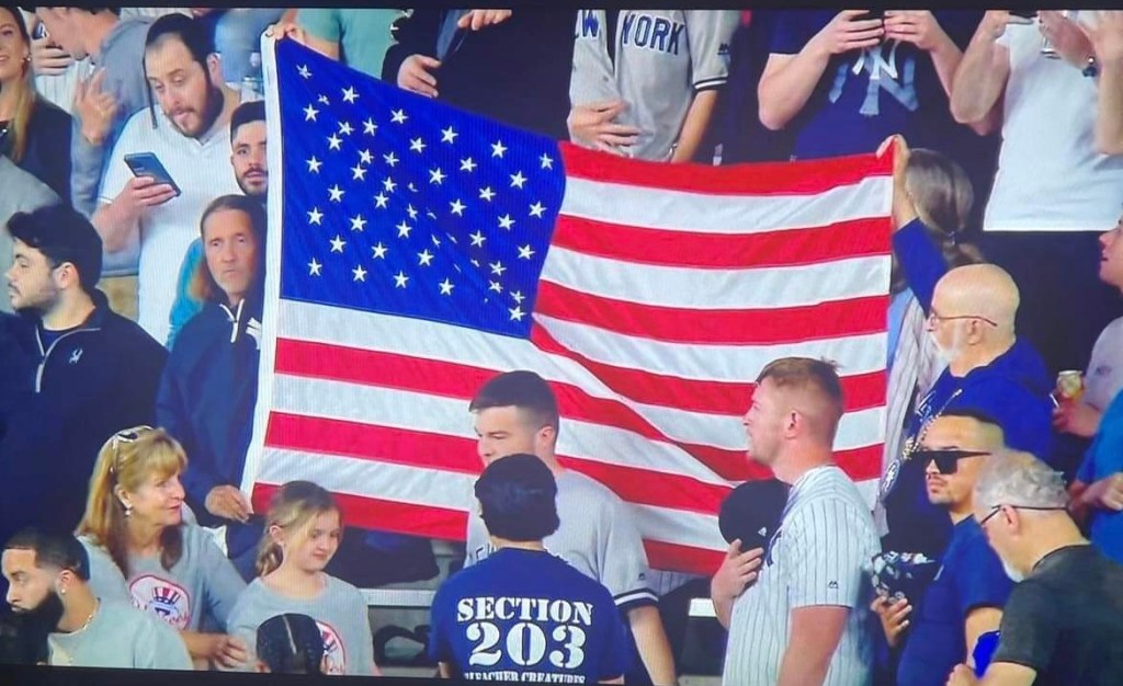 It’s the seventh inning stretch. Time for God Bless America. Chico and Frank hold the flag. If somebody doesn’t take their hat off, you can bet that Frank and Chico are going to holler at them to show some respect. Yep, on the Jumbotron again and on the YES network.