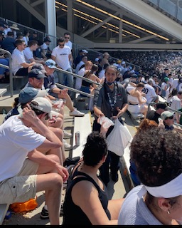 We look up at the top of the bleachers and give high fives in the air to Nannette, Becki, Face and Michael. When the Yankees score, it’s an event out in the Bleachers.