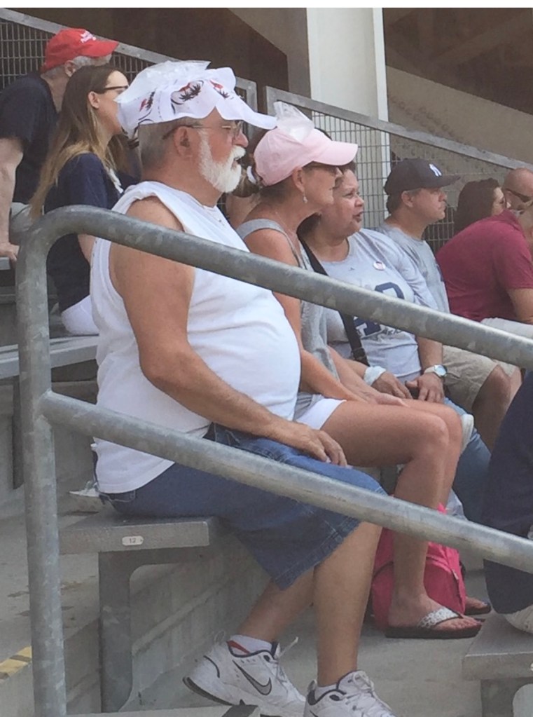 The rest of the game, I sit with my good buddy, Face. Julie, Nannette and Becki are sitting up there, too. I see a couple walk by. The guy has on a tank top, but it looks odd to me.