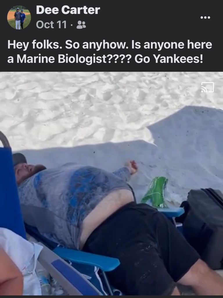 Me: Hey folk so anyhow. Is anybody here a marine biologist? Is anybody a marine biologist? We’ve got a, beached whale over here. Hello! Hello! Folks, I’m telling you what, when the Phillip’s are down here, I don’t need to think about doing videos or come up with funny things. All I gotta do is make sure I have my camera handy. No commentary needed folks. Bless his heart. Be good folks. Go Yankees!